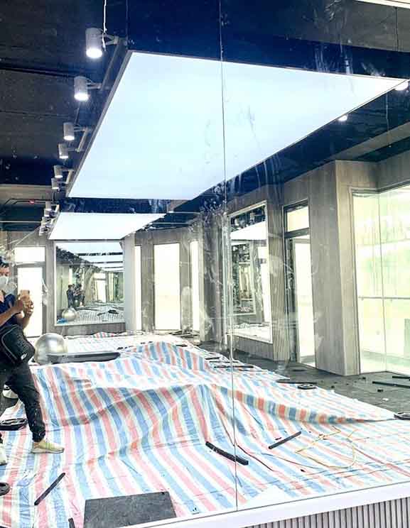 - Sau khi khảo sát, đo đạc thực tế tại mặt bằng, mô phỏng 3d bằng máy tính chuyên dụng và được khách hàng đồng ý, đội ngũ thợ sẽ tiến hành làm khung xương nhôm tạo độ cứng cho toàn bộ trần xuyên sáng, các khung xương này sẽ liên kết với nhau tạo khối hoàn chỉnh. Sau khi đảm bảo phần khung xương chắc chắn, sẽ đến phần lắp đặt hệ thống đèn chiếu sáng, các đèn được sử dụng là loại đèn led có độ toả cao đến 170 độ, các đèn led chiếu sáng dạng modun, nên sẽ được tính toán khoảng cách chính xác, nhằm đảm bảo toàn bộ hệ thống được chiếu sáng đồng đều, không có điểm quá sáng hoặc quá tối.
